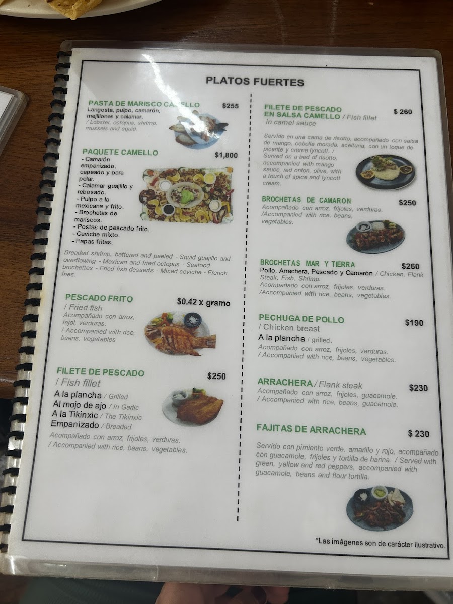 The menu at El Camello Jr., located in Tulum, primarily features a wide variety of seafood dishes reflecting local flavors and ingredients. The offerings include fried fish, various types of ceviche, mariscada (seafood platters), and seafood soups. Additionally, there are options such as brochetas combining land and sea, shrimp prepared in multiple styles including coconut and spicy "a la diabla," as well as grilled calamari and seafood pastas.