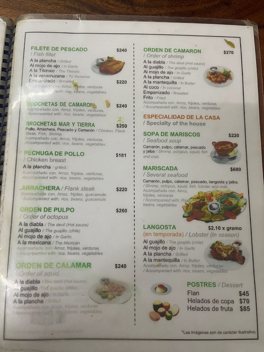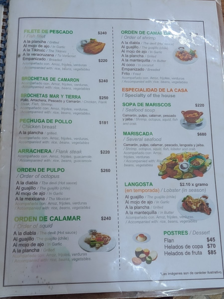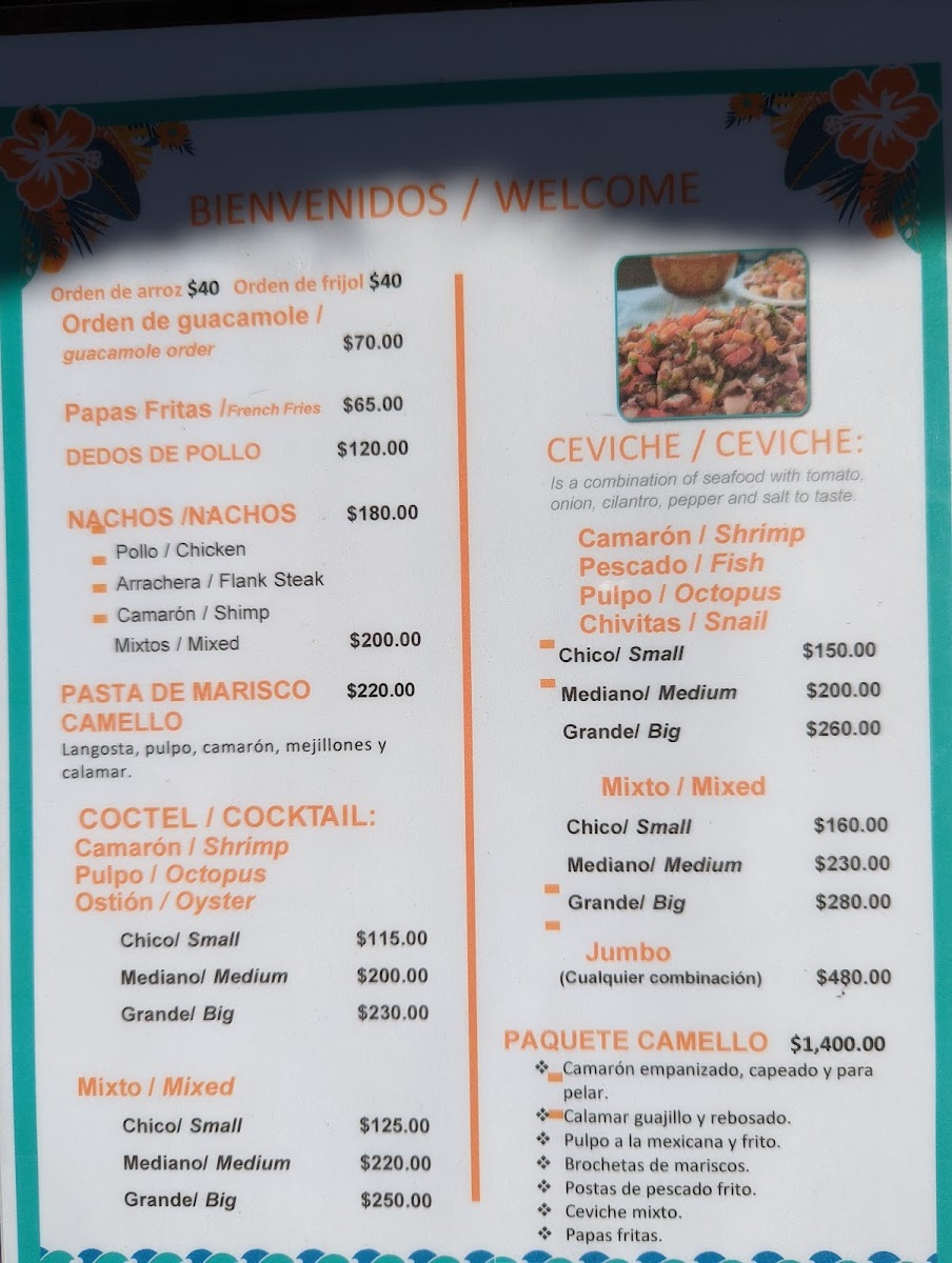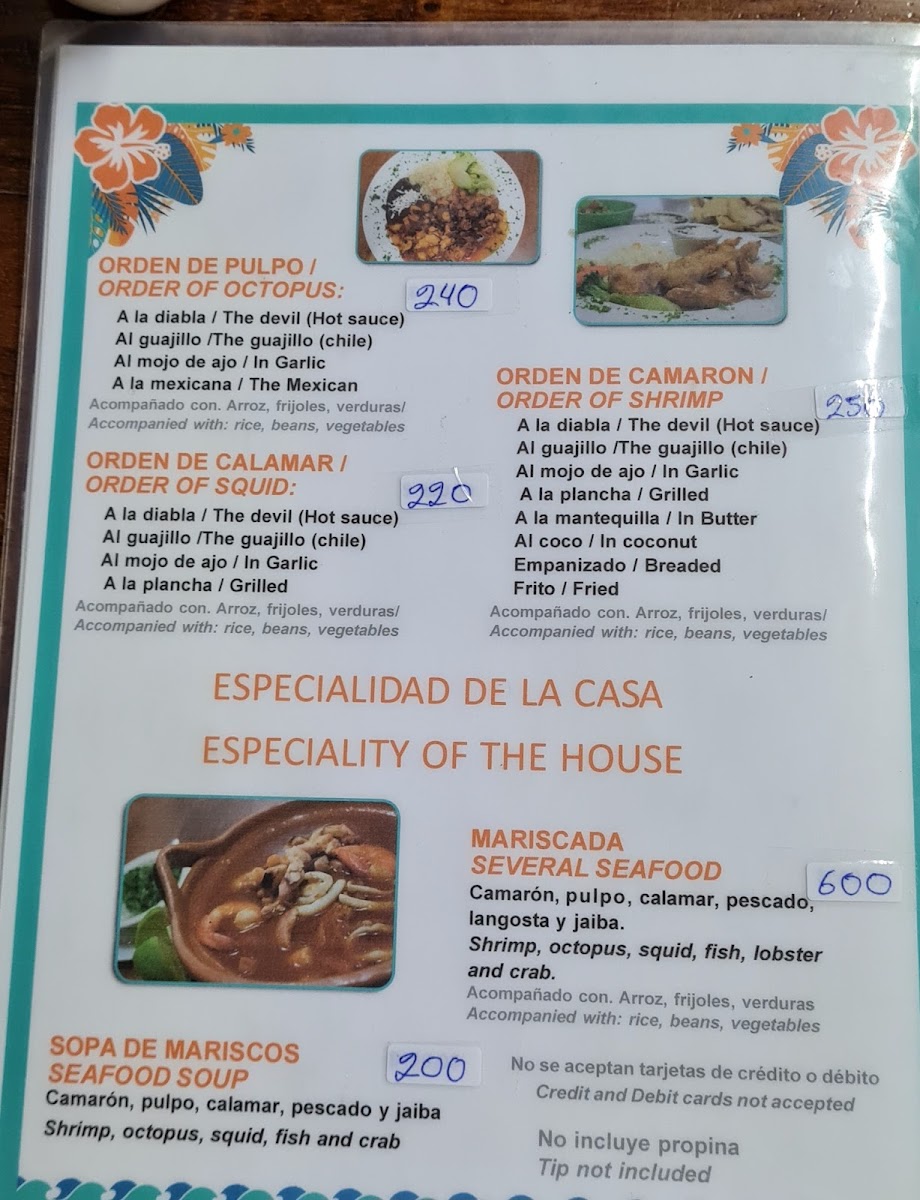 Guests can find appetizers and light bites like shrimp cocktail and mixed nachos, as well as main courses centered around fresh fish and shellfish. The menu also includes traditional accompaniments such as rice, as well as desserts like flan. Beverage selections include cocktails such as Caipiriña and Piña Colada, complementing the seafood meals.