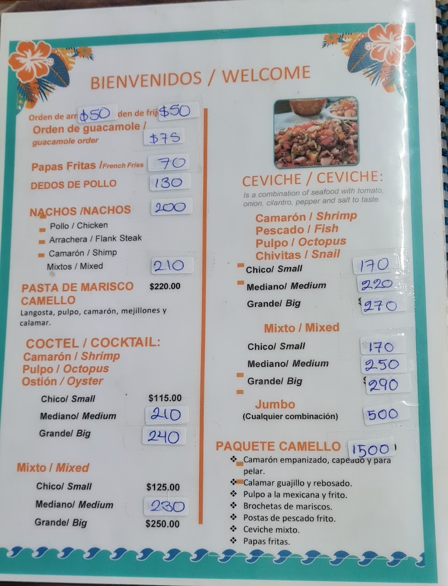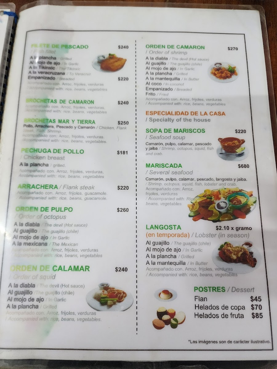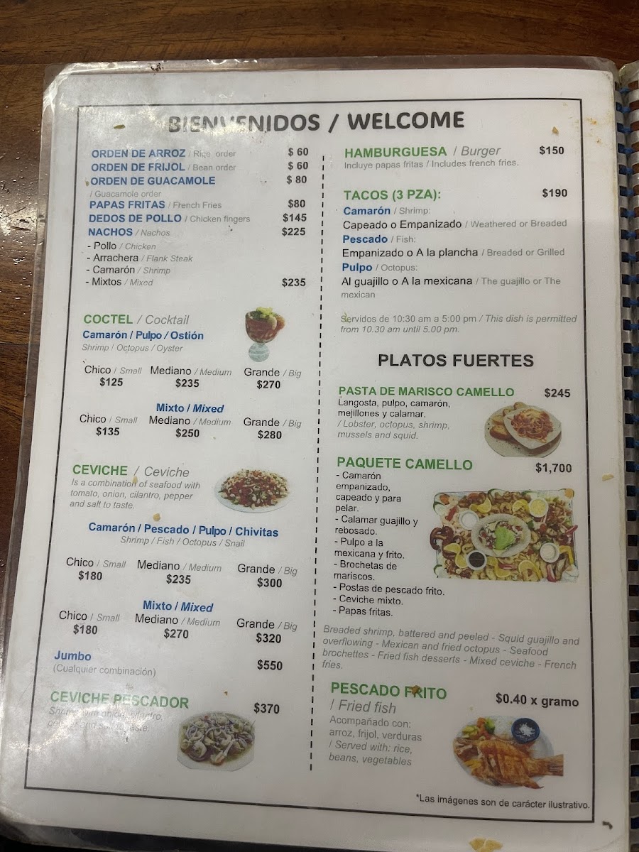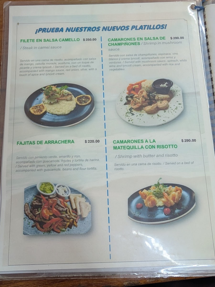 Guests can find appetizers and light bites like shrimp cocktail and mixed nachos, as well as main courses centered around fresh fish and shellfish. The menu also includes traditional accompaniments such as rice, as well as desserts like flan. Beverage selections include cocktails such as Caipiriña and Piña Colada, complementing the seafood meals.